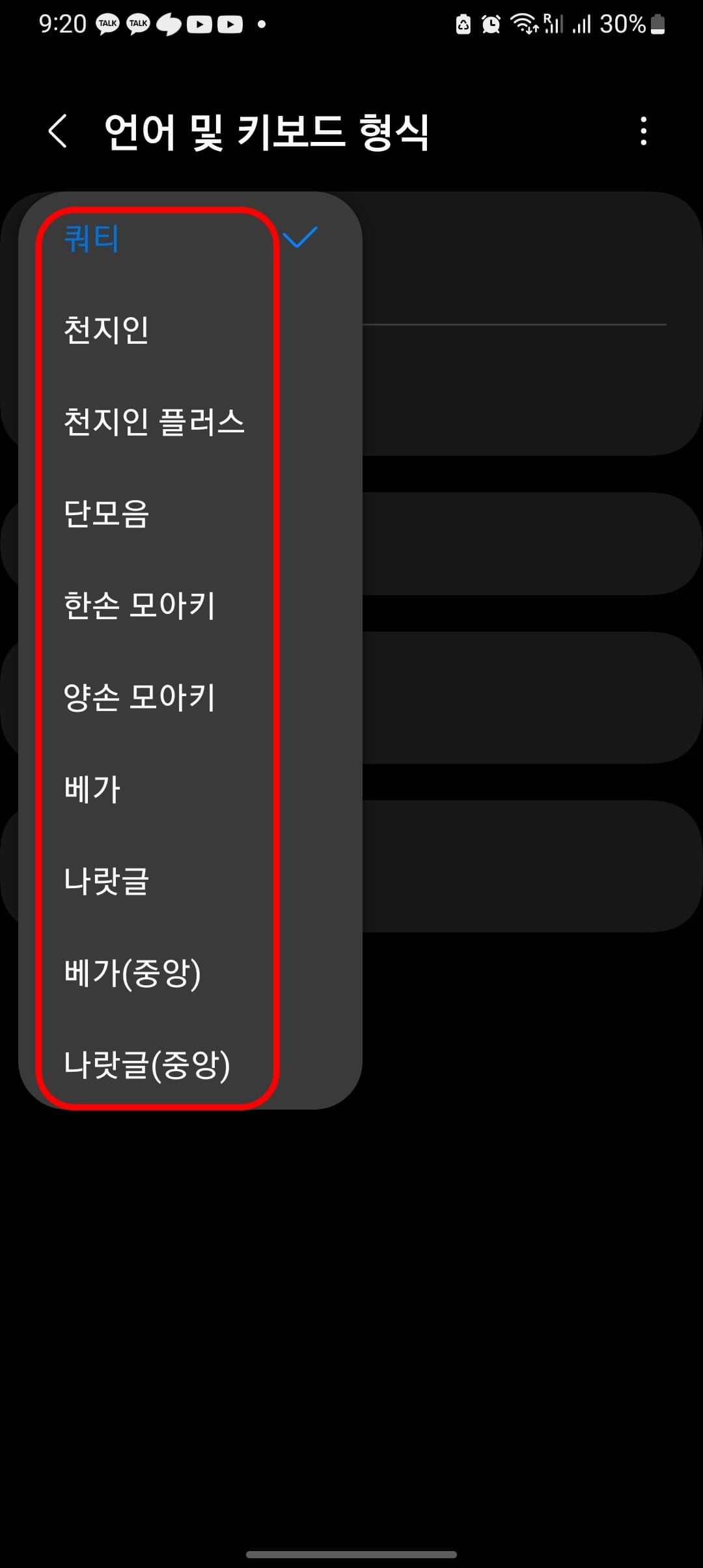 언어 및 키보드 형식에서 한국어를 터치하면 쿼티, 천지인, 천지인 플러스, 단모음, 한 손 모아키, 양손 모아키, 베가, 나랏글, 베가 (중앙), 나랏글 (중앙) 중에서 자신이 원하는 키보드 설정을 변경할 수 있습니다. 각 키보드의 특징은 아래에서 확인하시기 바랍니다.