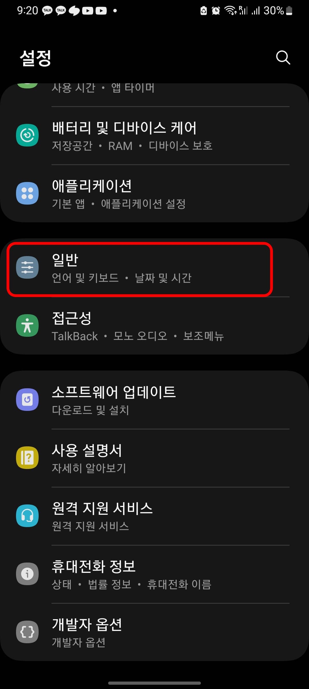 갤럭시 키보드를 변경하기 위해서는 먼저 설정 메뉴를 터치합니다. 설정 메뉴로 이동해서 스크롤을 아래로 내리다 보면 일반 메뉴를 발견할 수 있습니다. 일반 메뉴에서는 언어 및 키보드, 날짜 및 시간 설정을 지원합니다.