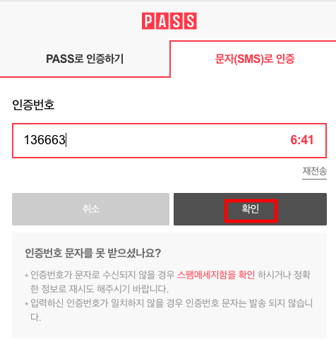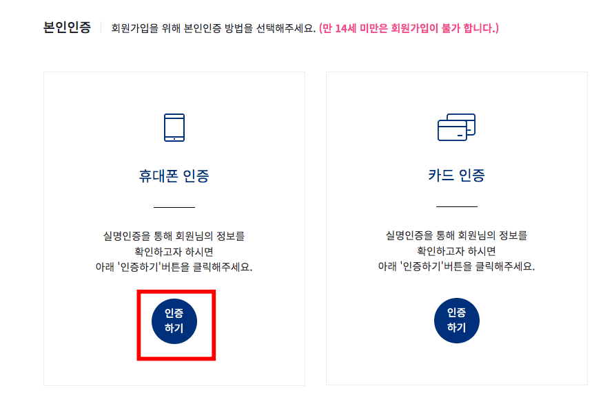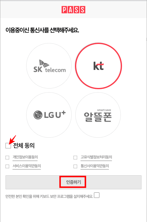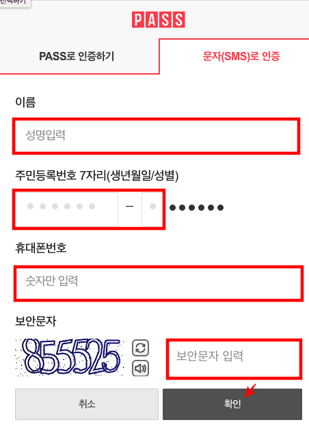 본인인증 페이지가 표시되면 휴대폰 인증 또는 카드 인증 중 원하는 인증 수단을 선택합니다. 여기에서는 휴대폰 인증을 선택해 보았습니다. 이용 중인 통신사를 선택하고 하단의 전체동의 표시를 체크한 후 인증하기 버튼을 클릭합니다. 문자로 인증을 선택한 후 이름, 주민등록번호 7자리, 휴대폰 번호, 보안문자입력 후 하단의 확인버튼을 클릭합니다. 인증번호가 휴대폰에 도착하면 입력 후 확인버튼을 클릭합니다.