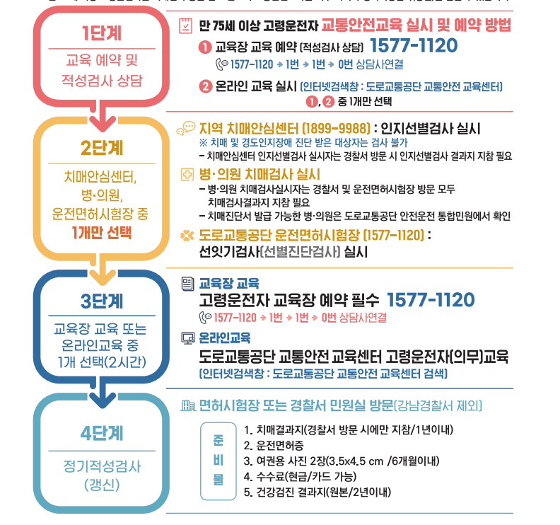 고령운전자 교통안전교육 신청 방법에 대해 알아보겠습니다. 우리나라는 도로교통법 상에 만 75세 이상인 사람이 운전면허를 취득하거나 갱신할 때 도로교통공단의 교육을 받도록 하고 있습니다. 이러한 이유는 고령자 일 수록 기억력과 판단하는 능력 등 운전 시 대처할 수 있는 안전운전에 관한 교육이 필요하기 때문입니다.