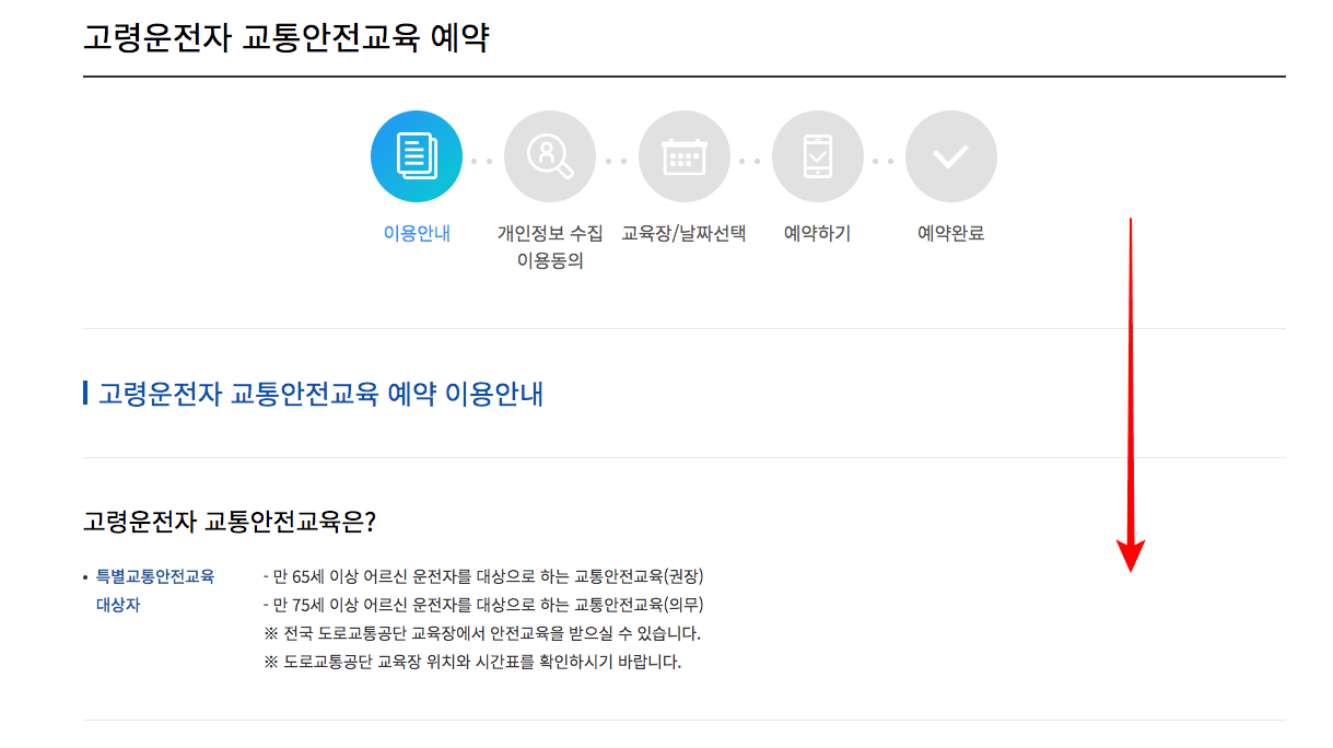 도로교통공단 안전운전 통합민원 홈페이지에 방문하시면 위와 같은 화면을 보게 됩니다. 메인 메뉴에서 [고령운전자 교통안전교육] 메뉴를 선택합니다. 교육 예약 페이지가 표시되면 스크롤을 내려 내용을 확인합니다. 교통안전교육은 아래와 같은 절차로 진행됩니다.