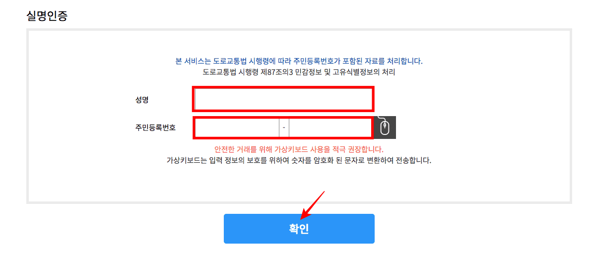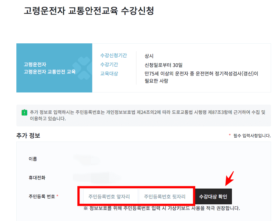 고령운전자 교통안전교육 수강신청 페이지 하단에서 주민등록번호를 입력하고 우측 수강대상 확인 버튼을 클릭한 후 하단에서 신청 버튼을 클릭하면 수강 신청을 시작할 수 있으니 직접 확인해 보시기 바랍니다.