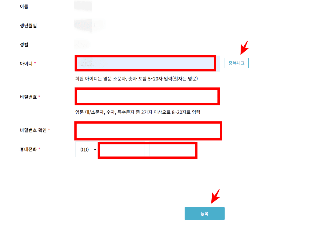 아이디 입력 후 우측의 중복체크 버튼을 클릭하여 사용가능 여부를 조회합니다. 이후 비밀번호와 비밀번호 확인에 비밀번호를 똑같이 입력하고 휴대전화 번호 입력후 하단의 등록 버튼을 클릭합니다.