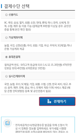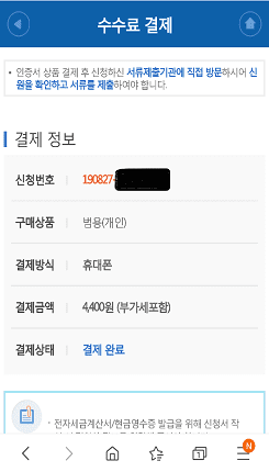 공동인증서 신청접수가 완료됩니다. 이후 결제수단을 선택하시고 화면 하단에서 결제하기 버튼을 터치합니다.