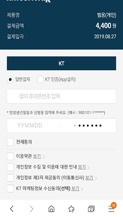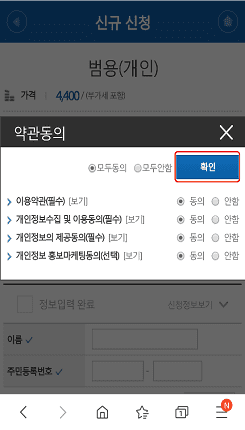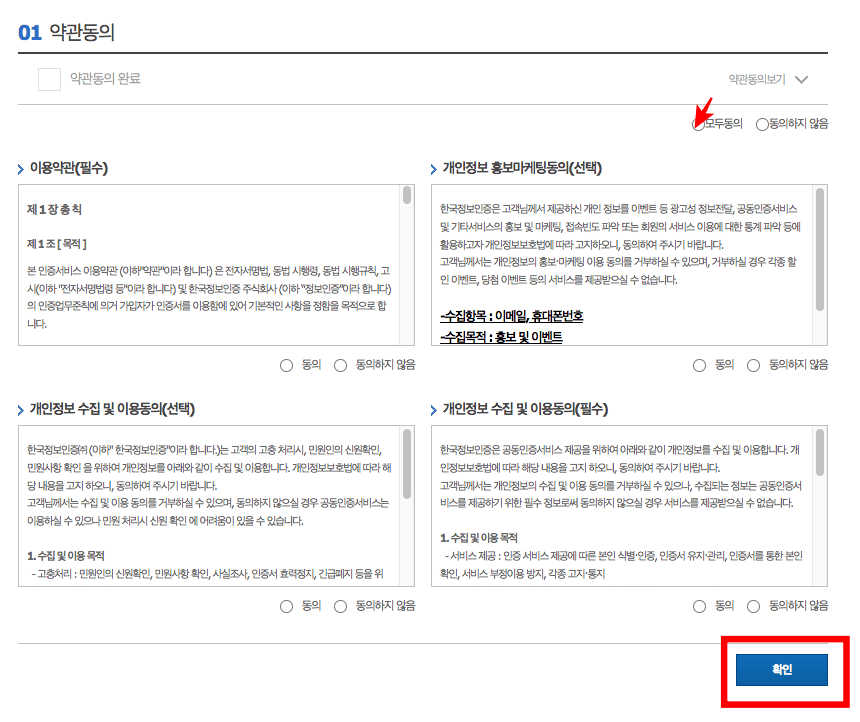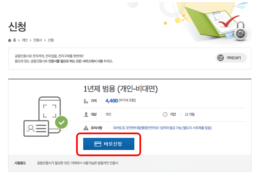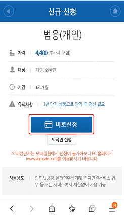 1년제 범용 공동인증서는 4400원의 수수료가 부과됩니다. 하단의 바로신청 버튼을 클릭합니다. 약관동의를 확인하시고 모두동의 표시를 하신후 하단의 확인버튼을 클릭합니다.