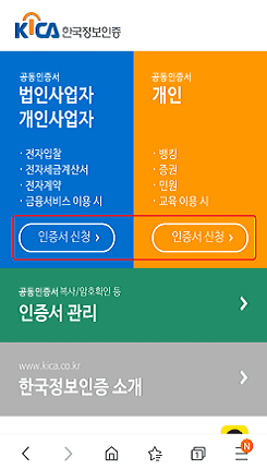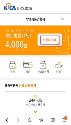 먼저 구글 플레이스토어나 앱스토어에서 한국정보인증 앱을 설치합니다. 이후 앱을 실행하시고 개인 공동인증서 신청 메뉴를 터치합니다. 다음 페이지상단의 신청하기 버튼을 터치합니다. 신규 신청이라면 4400원의 비용이 필요합니다. 하단의 바로신청 버튼을 터치합니다.