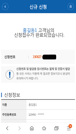 선택한 결제수단에 따라 결제를 진행하시면 마지막으로 수수료결제가 완료되면서 범용 공동인증서가 발급된 것을 확인할 수 있습니다. 발급된 인증서는 앱내에서 PC로 이동하거나 타행기관 등록을 통해 모든 금융서비스에서 사용가능합니다.