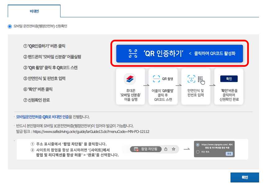 모바일 운전면허증 어플을 실행하시고 QR코드클릭후 코드를 스캔합니다. 이후 안면인식 및 핀번호를 입력하시고 확인버튼을 클릭하면 신원확인이 완료됩니다.
