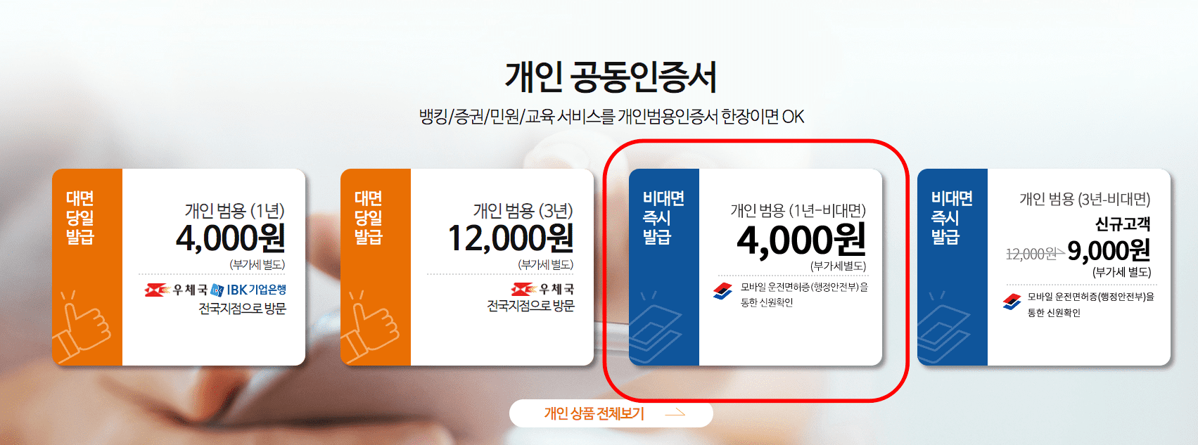 홈페이지 메인 화면에 도착하시면 개인 공동인증서를 선택합니다. 개인 공동인증서 중 비대면 즉시 발급 메뉴를 클릭합니다.