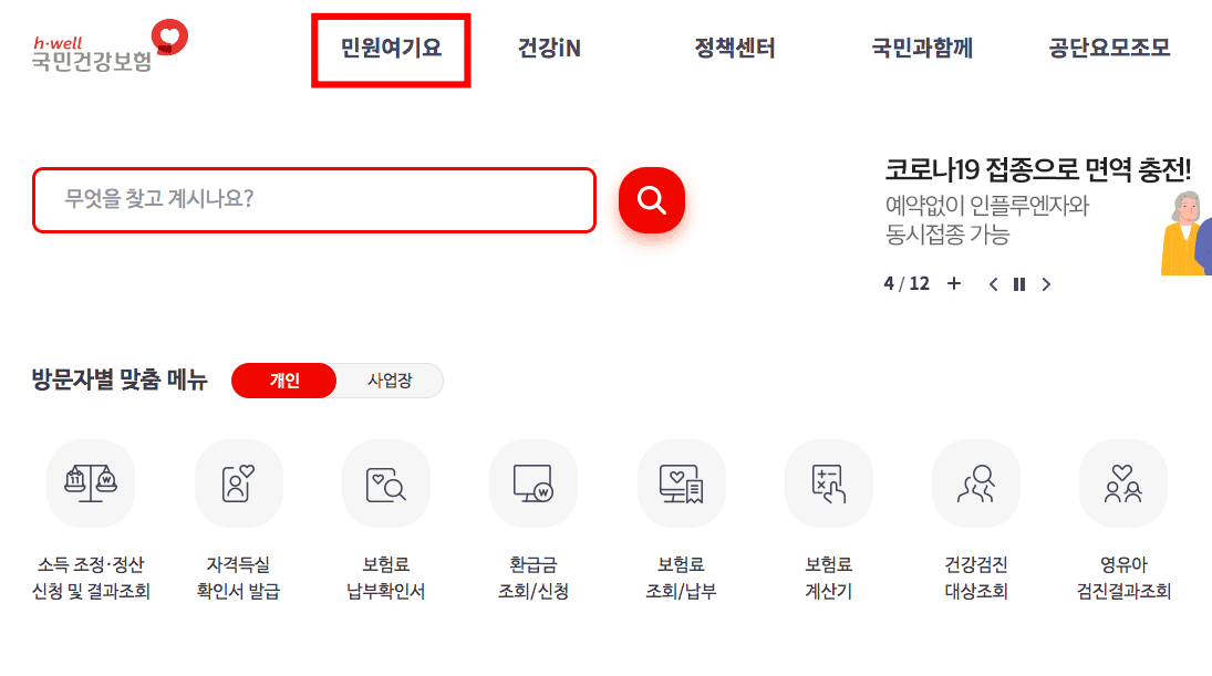 국민건강보험 홈페이지에 방문하시면 위와 같은 첫 화면을 볼 수 있습니다. 상단 메인 메뉴 중 [민원 여기요]로 마우스를 가져갑니다. 하단에 세부 메뉴가 생성되면 개인민원을 선택합니다.