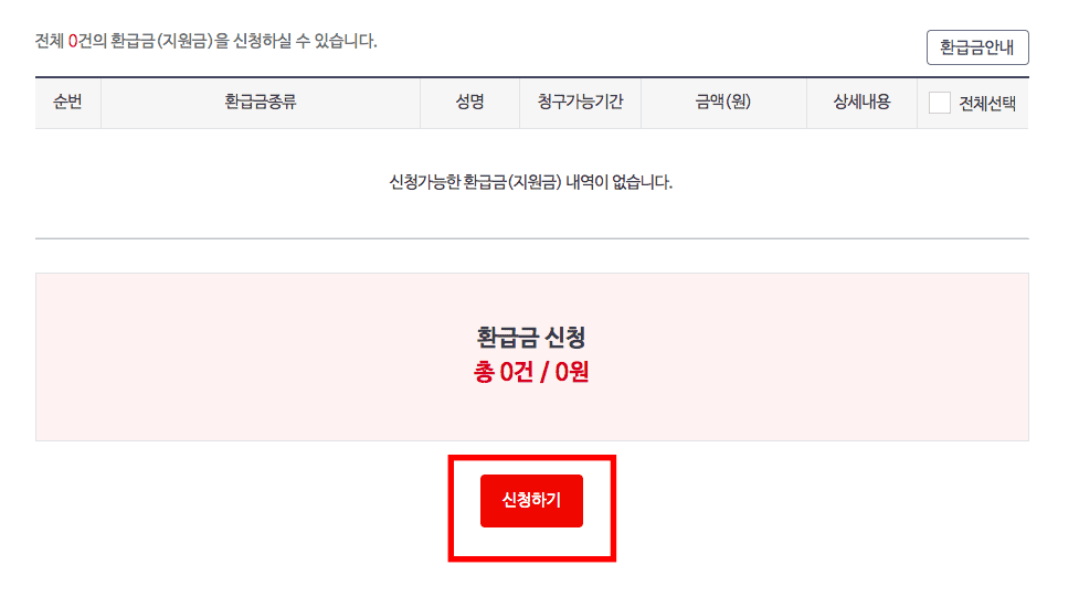 모든 인증이 완료되면 신청가능한 환급금이 화면에 표시됩니다. 하단의 신청하기 버튼을 클릭하면 국민건강보험공단 환급금 조회 및 신청이 완료됩니다.