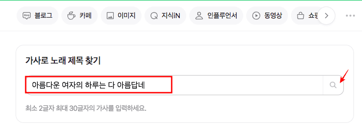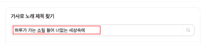 가사로 노래 제목 찾기 하단 입력창에 가사를 입력하고 엔터키 또는 우측의 돋보기 아이콘을 클릭합니다.