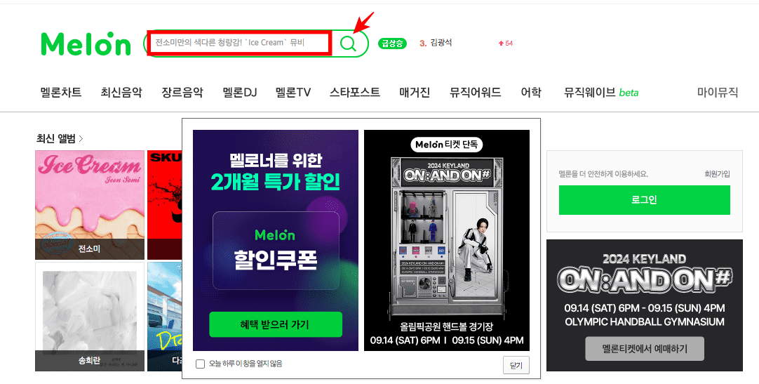 멜론 홈페이지에 도착하시면 위와 같은 메인화면을 보게 됩니다. 상단 검색창에 가사를 입력하고 우측의 돋보기 아이콘을 클릭합니다. 검색 결과를 확인하시면 노래 제목과 가사가 검색되는 것을 확인할 수 있습니다.