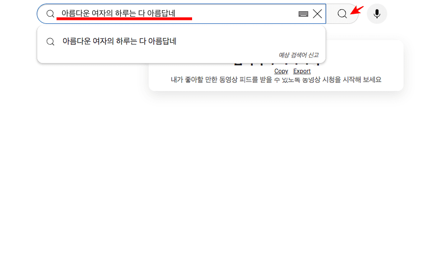 유튜브 홈페이지에 도착하시면 위와 같은 메인 화면을 볼 수 있습니다. 상단 검색창에 기억하고 있는 가사를 입력하고 엔터키 또는 우측의 돋보기 아이콘을 마우스로 클릭합니다.