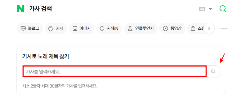 가사로 노래 제목 찾기 하단 입력창에 가사를 입력하고 엔터키 또는 우측의 돋보기 아이콘을 클릭합니다.