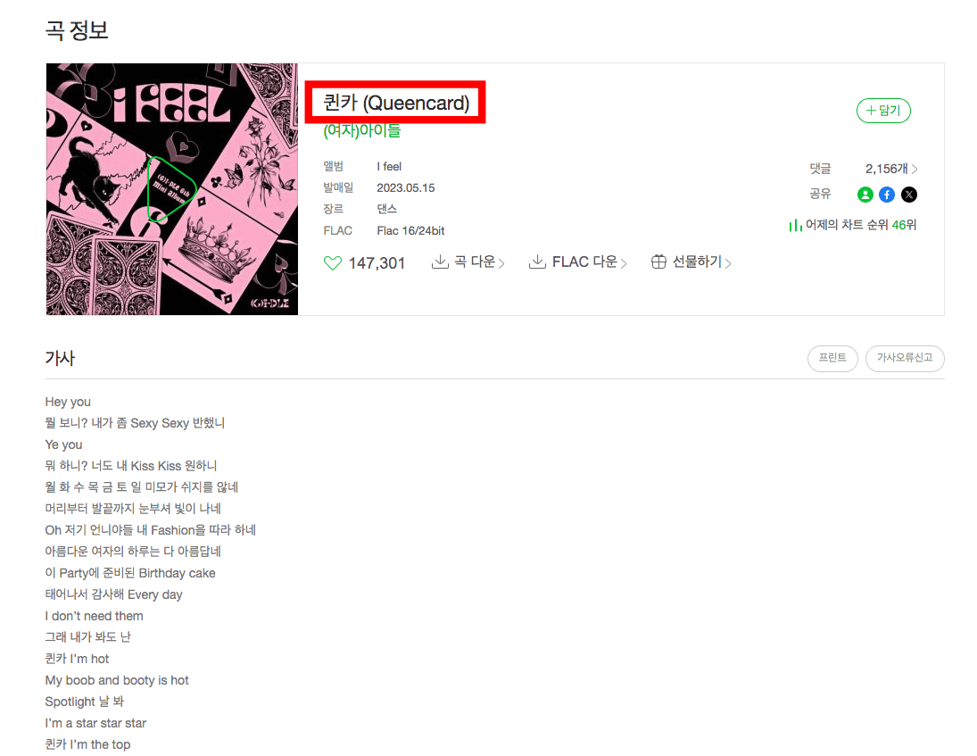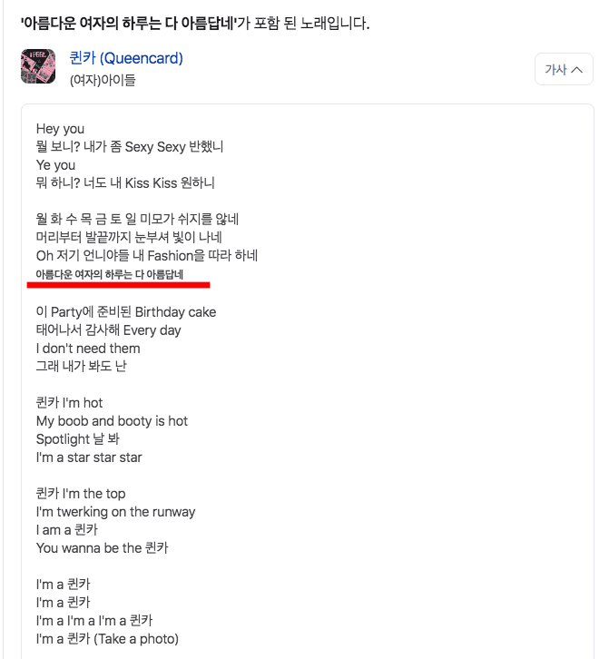 검색결과를 확인하니 여자아이들의 퀸카가 검색되는 것을 확인할 수 있습니다. 우측의 가사메뉴를 클릭하면 전체 가사를 확인할 수 있습니다.