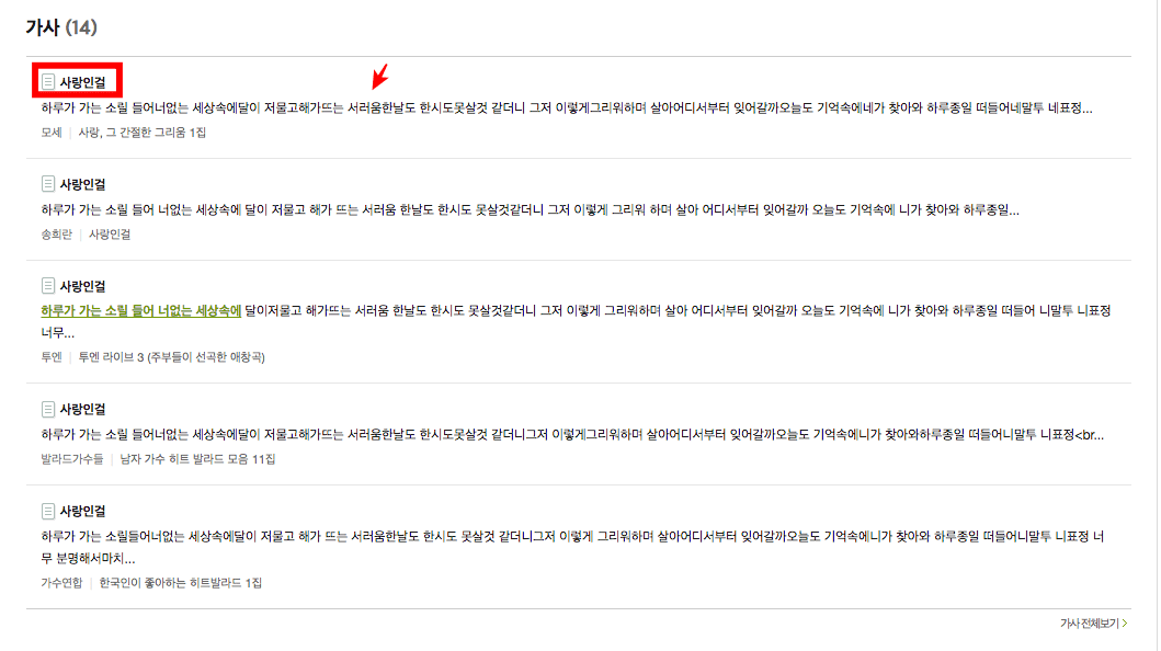 한번 더 아까와 마찬가지로 가사를 검색해 보았습니다. 모세의 사랑인걸을 비롯한 다른 가수가 부른 버전까지 검색이 되는 것을 확인할 수 있었습니다.