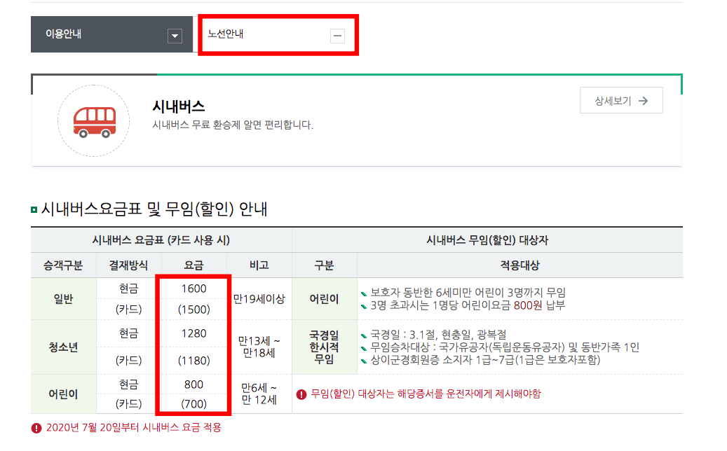 시내버스 페이지를 확인하시면 시내버스 요금이 일반의 경우 1600원, 카드의 경우 1500원임을 알 수 있습니다. 상단의 ‘노선안내’를 클릭하시면 논산시에 다니는 시내버스의 노선도를 하단 버튼을 통해 확인할 수 있습니다.