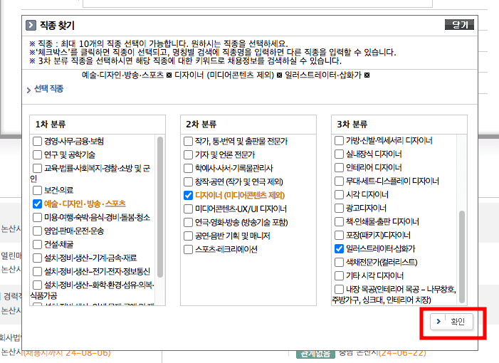 논산시 일자리 지원센터에 도착하시면 위와 같은 화면을 보게 됩니다. 하단에 있는 ‘채용검색’ 메뉴의 [직종]을 마우스로 클릭합니다. 직종 찾기 창이 뜨면 희망하는 1차, 2차, 3차 직종 분류를 알맞게 선택합니다. 이후 하단의 확인버튼을 클릭합니다.