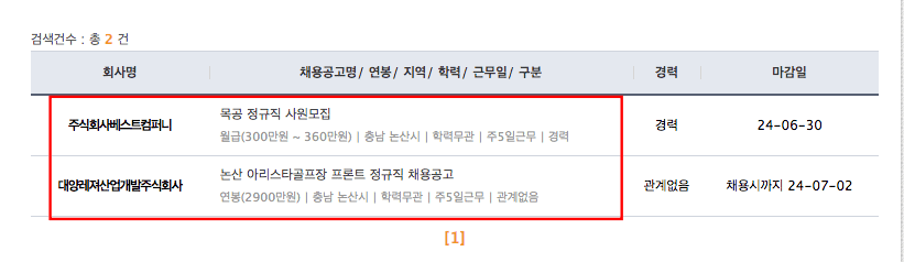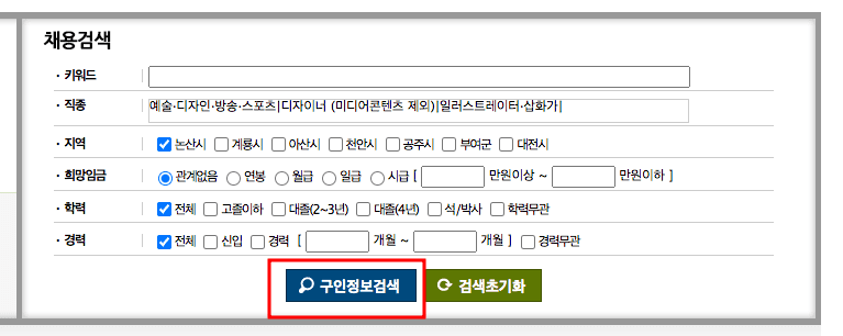 이후 채용검색이 다시 보이면 하단의 ‘구인정보검색’ 버튼을 선택합니다. 검색 결과를 확인하시면 직종 분류에 맞는 채용 정보가 표시되는 것을 확인할 수 있으니 직접 확인해 보시기 바랍니다.