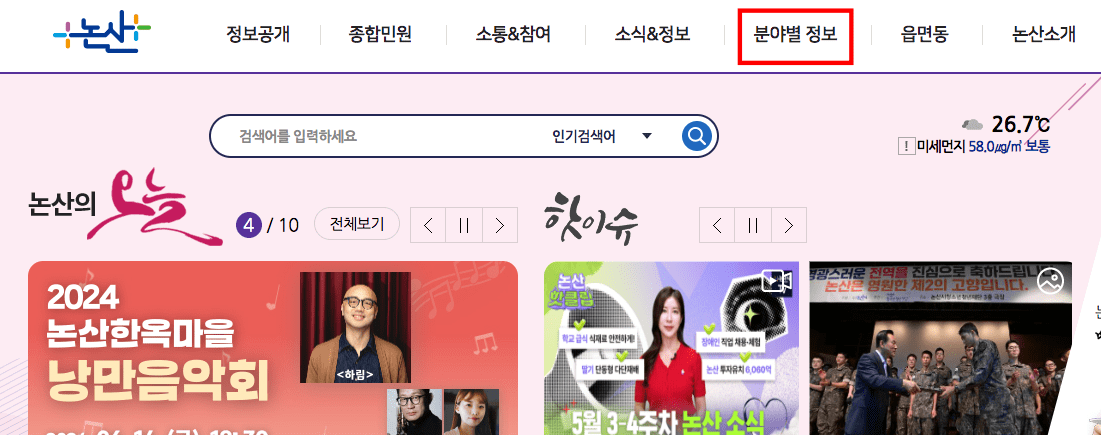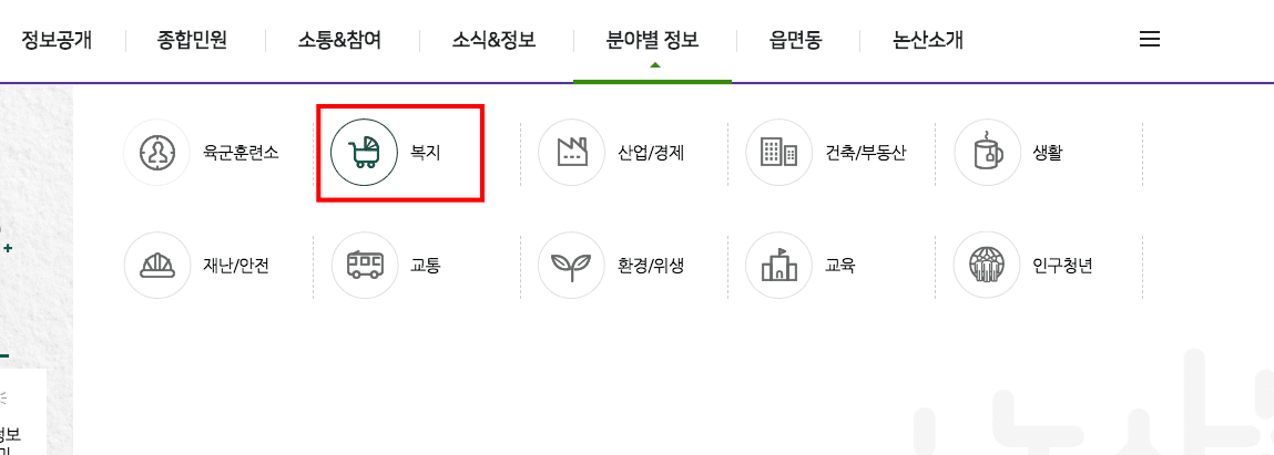 논산시 홈페이지에 도착하시면 위와 같은 화면을 볼 수 있습니다. 상단 메뉴에서 ‘분야별 정보’ 로 마우스를 가져가면 하단에 하위 메뉴가 보입니다. 여기에서 복지 메뉴를 선택합니다.