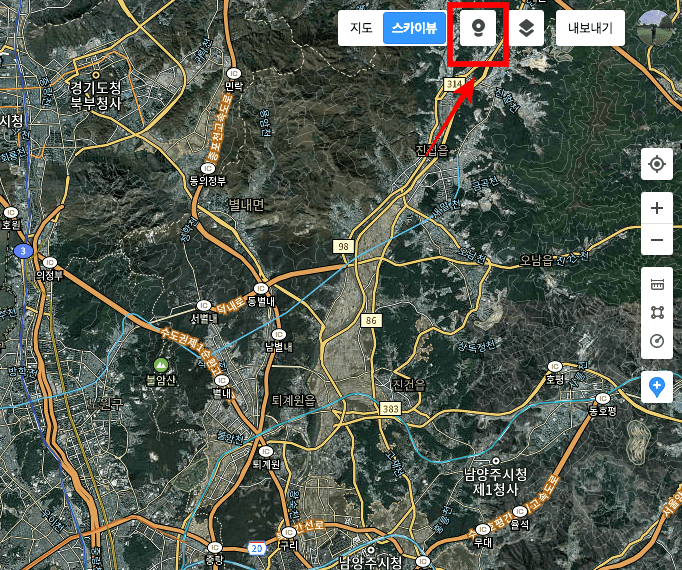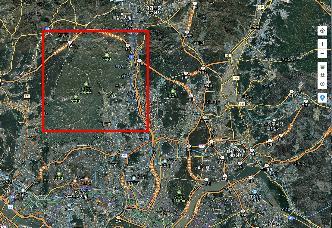 한 번만 확대해도 한반도가 자세히 보이는 것을 확인할 수 있습니다. 두 번 클릭하면 대한민국이 잘 보이게 됩니다. 좀 더 여러 번 확대하면 시나 군까지 자세하게 확인할 수 있습니다. 위성지도를 보다면 북한산 국립공원과 같은 흥미로운 장소가 나타나면 우측 상단에 표시된 아이콘을 드래그하여 북한산 국립공원에 가져다가 놓습니다.