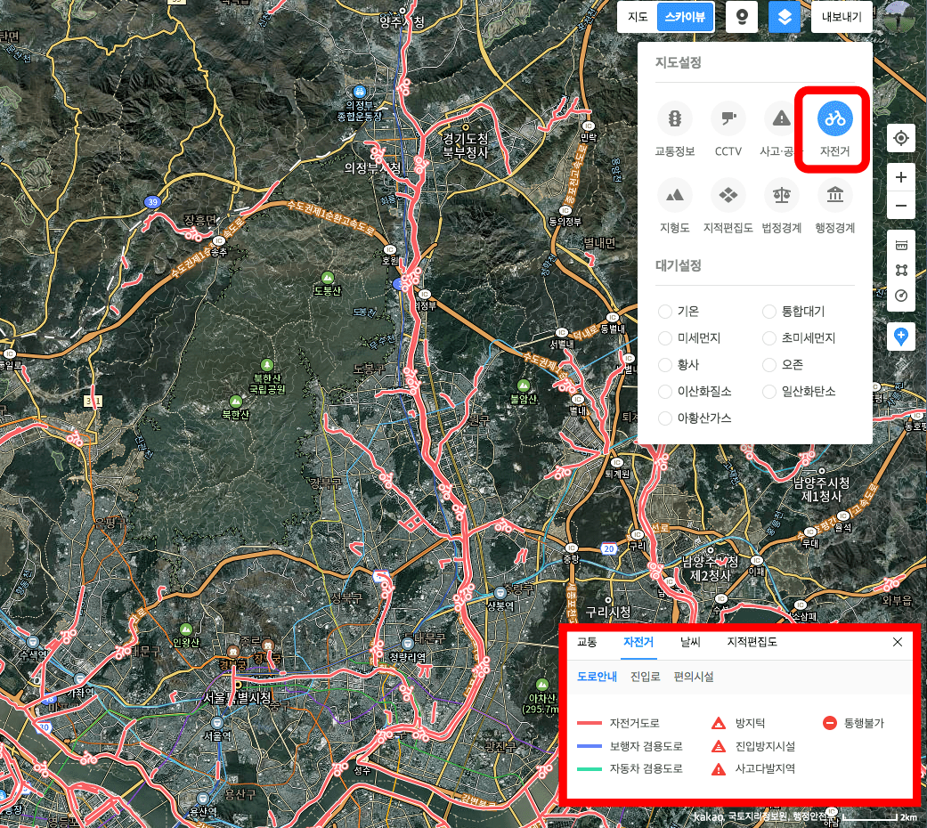 다음 위성지도 스카이뷰는 지도의 축소와 확대뿐만 아니라 교통정보, 사고 및 공사, 자전거 도로, 지적편집도 등 다양한 부가적인 기능을 제공하고 있습니다.