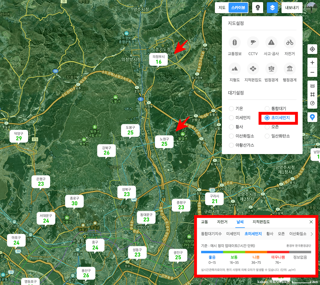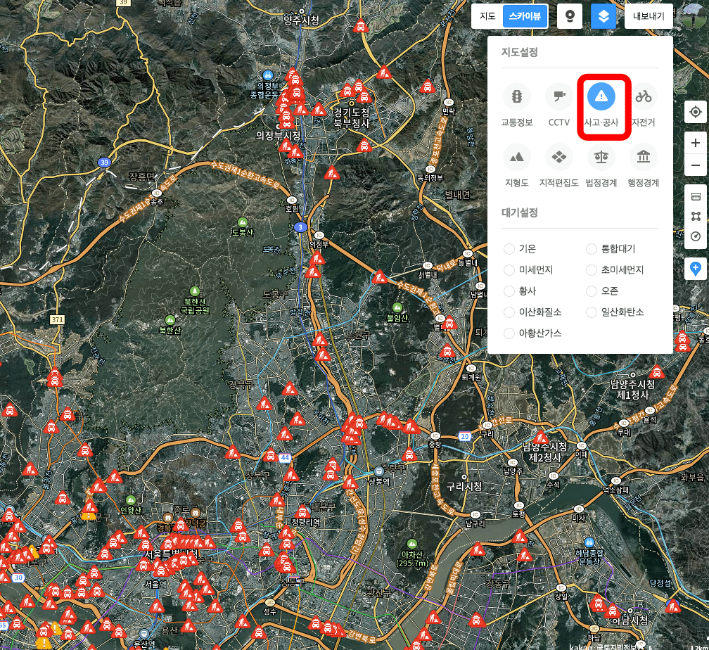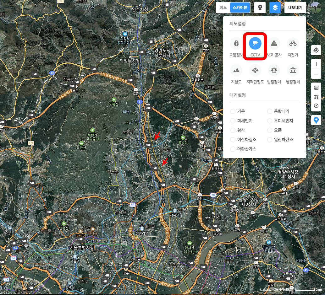 저 또한 다음 위성지도가 나오고 지금의 카카오맵이 되기까지 위성지도를 사용하면서 일반적으로 이용하지 않은 다양한 기능들을 발견할 수 있었습니다. 대표적으로 교통정보나 CCTV 설치 장소, 미세먼지에 의한 대기상황까지 다양하게 위성지도로 확인할 수 있습니다.