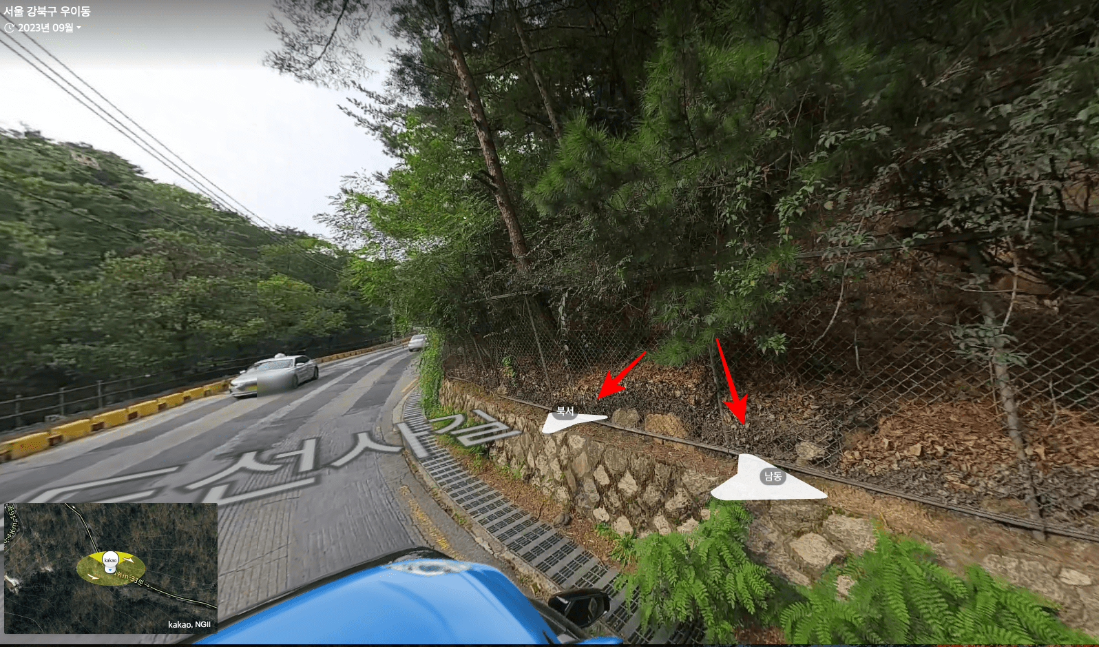 이후 북한산 국립공원의 도로가 로드뷰로 표시됩니다. 북서, 남동 두 가지 방향을 마우스로 클릭하면 화면도 함께 이동됩니다. 화살표를 따라가다 보면 마치 자동차를 타고 이동하는 것 같은 기분이 들 수 있으니 한번 시도해 보시기 바랍니다.