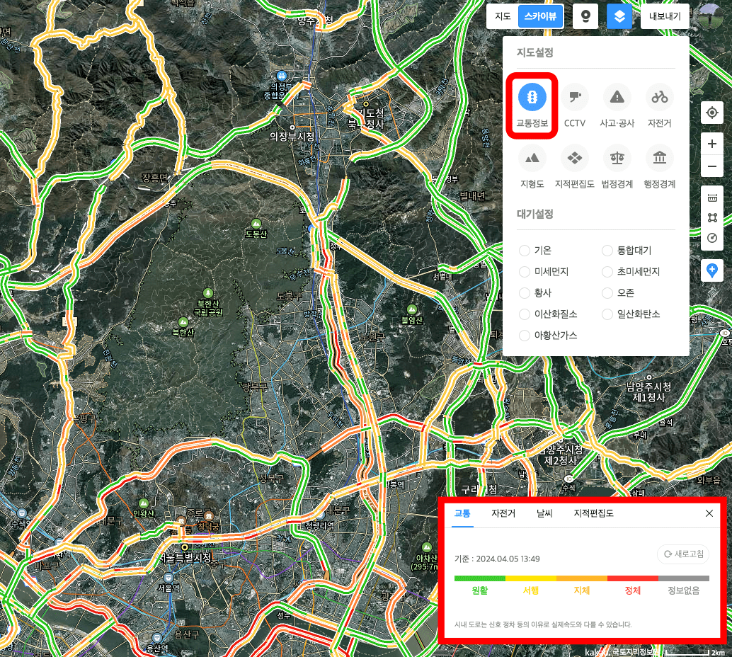 교통정보를 선택하면 현재 보고 있는 위성지도 위로 교통량이 색깔별로 표시되게 됩니다. 초록색으로 되어 있는 도로가 교통량이 원활하다는 것을 알 수 있습니다. 이후 지도설정에서 CCTV를 선택하면 도로 위에 CCTV가 설치된 장소가 위성지도 위에 표시됩니다. 이를 통해 과속단속을 피할 수 있습니다.