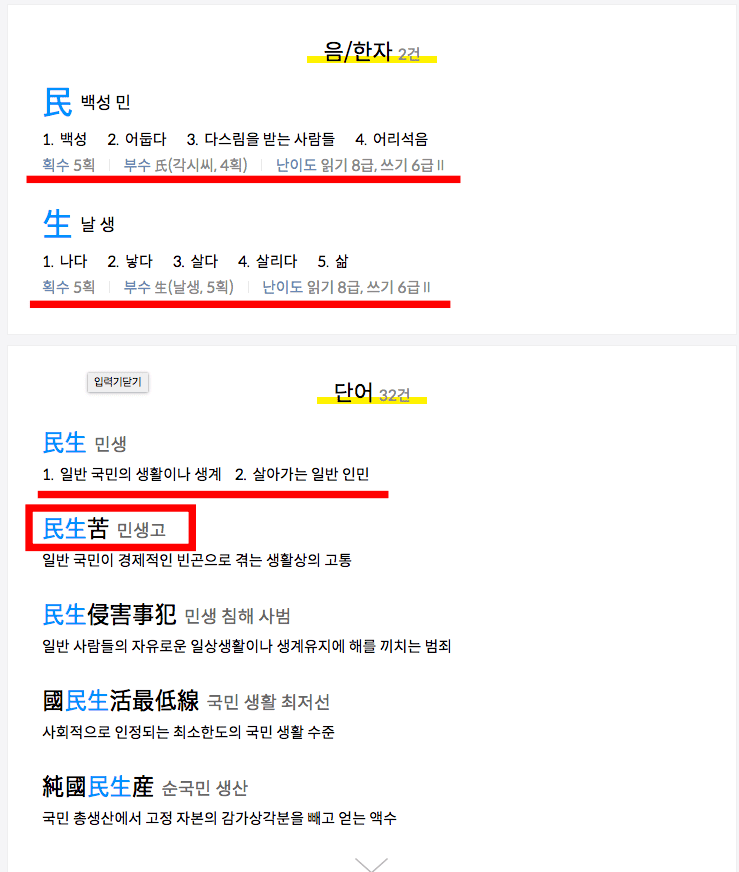 두 가지 한자가 입력되었으면 우측의 돋보기 아이콘을 클릭합니다. 검색결과를 확인하시면 사용된 두 가지 한자의 이름이 백성 민, 날 생이라는 것과 부수, 획수, 난이도 등을 알 수 있습니다. 하단에는 민생이라는 단어가 사용된 다른 한자들도 있으니 살펴보는 것도 한자 공부에 도움이 될 것입니다.