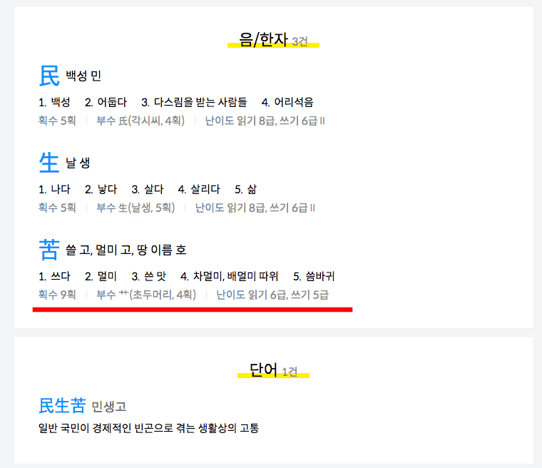 민생고에 사용된 마지막 한자는 쓸 고이며, 민생고의 뜻은 일반 국민이 경제적인 빈곤으로 겪는 생활상의 고통을 의미한다고 합니다. 이렇게 한자의 어휘를 늘려나갈 수도 있으니 한번 직접 확인해 보시기 바랍니다.