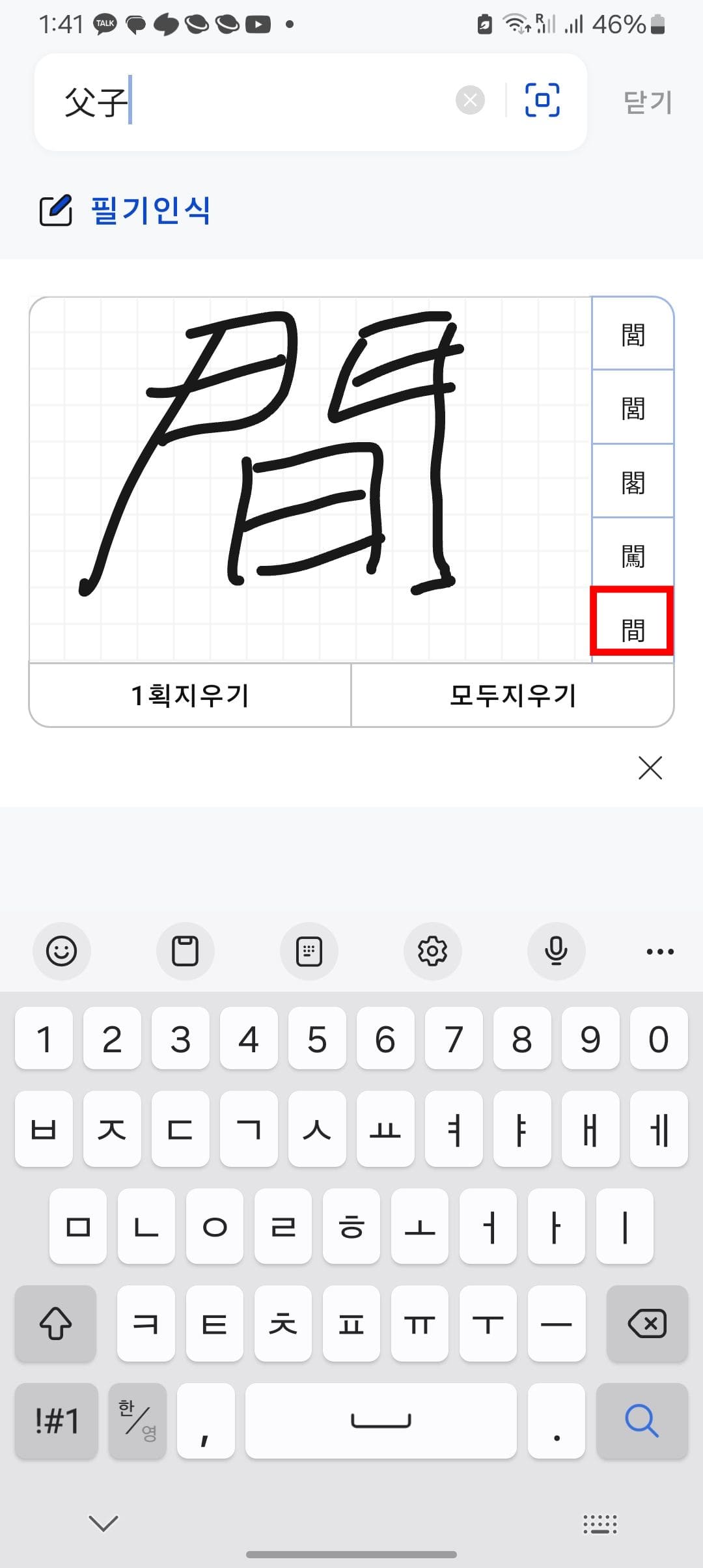 부자간이라는 한자를 완성해 보겠습니다. 검색창을 클릭하고 우측의 필기인식 아이콘을 터치하면 다시 필기인식 영역이 표시됩니다. 마지막 한자를 그리고 우측에서 유사한 한자를 찾아 터치합니다. 세 글자가 모두 입력되었으면 하단의 검색 버튼을 터치합니다.