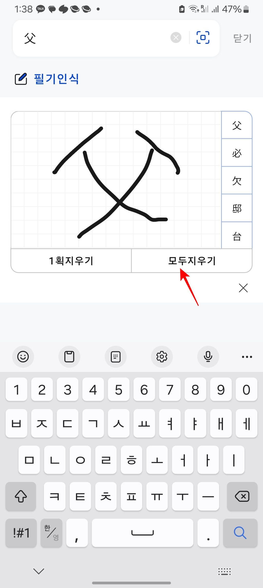 PC와 마찬가지로 필기인식 영역이 표시되면 직사각형 안에 한자를 손가락으로 그려줍니다. 만약 한자 모양이 이상하면 인식이 잘 되지 않으므로 하단의 모두 지우기 버튼을 터치하여 지우고 다시 그립니다.