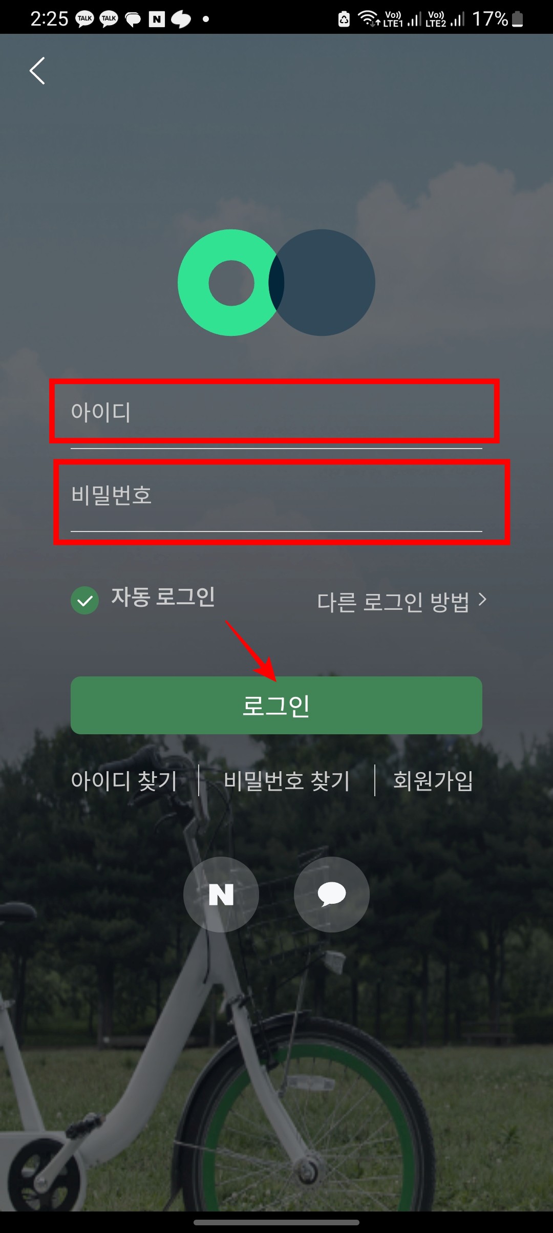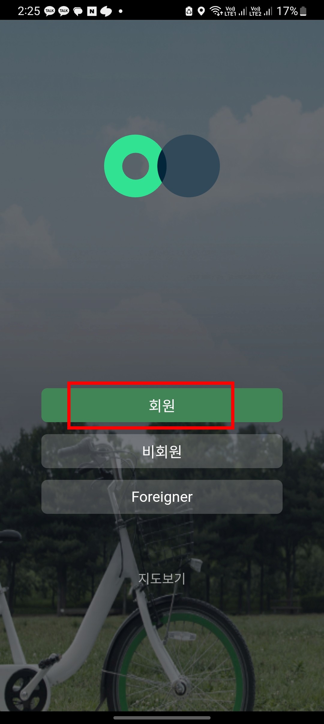 회원, 비회원, 외국인 선택 화면이 표시되면 자신에게 해당하는 메뉴를 터치합니다. 아이디와 비밀번호를 입력하시고 하단의 로그인 버튼을 터치합니다.