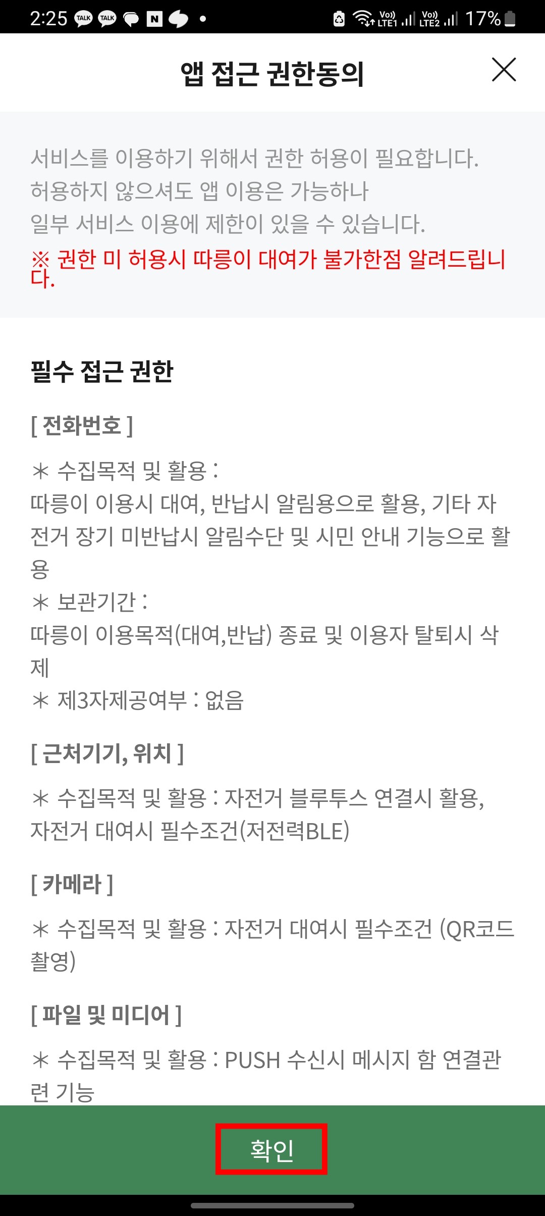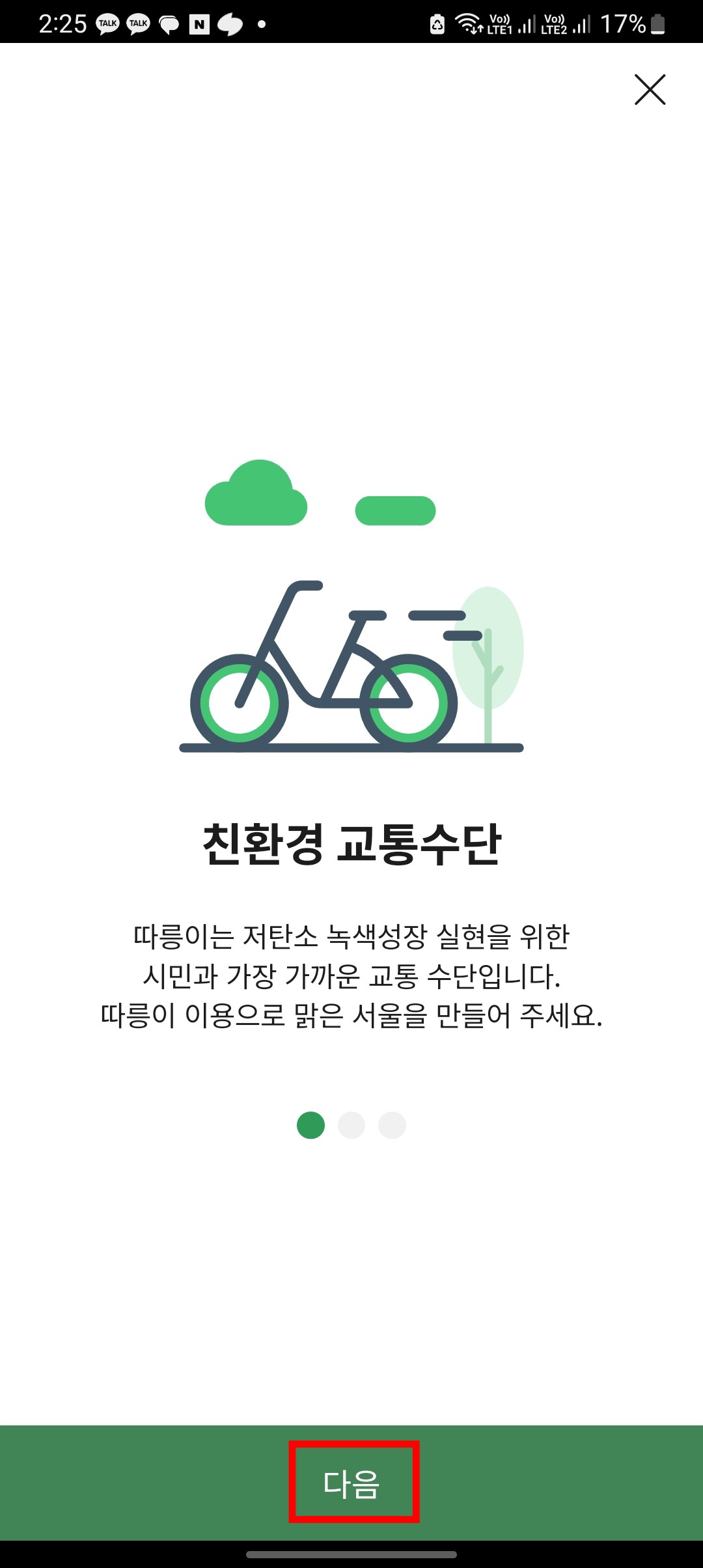 따릉이 앱을 실행하시면 위와 같은 화면을 볼 수 있습니다. 앱 접근 권한동의를 확인하시고 하단의 확인 버튼을 터치합니다. 이후 따릉이 설명이 나오면 하단의 다음 버튼을 여러 번 터치합니다.