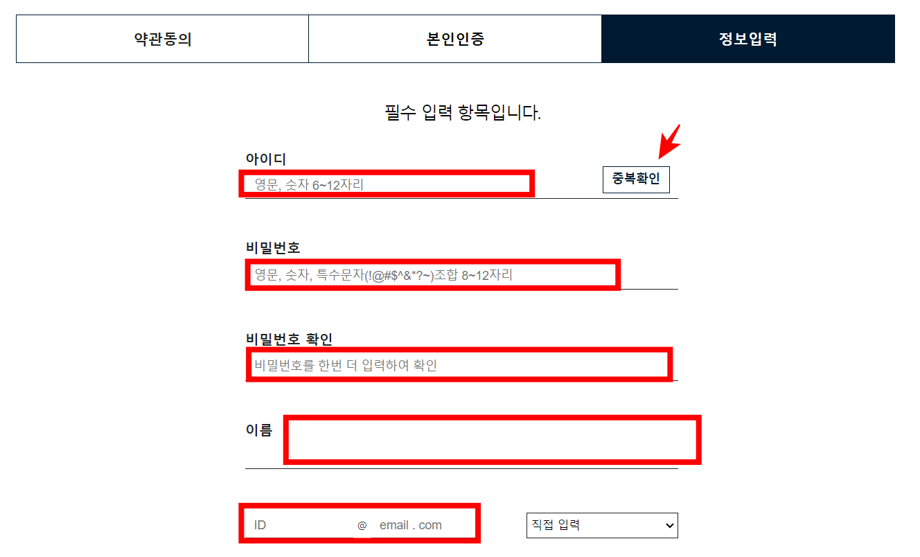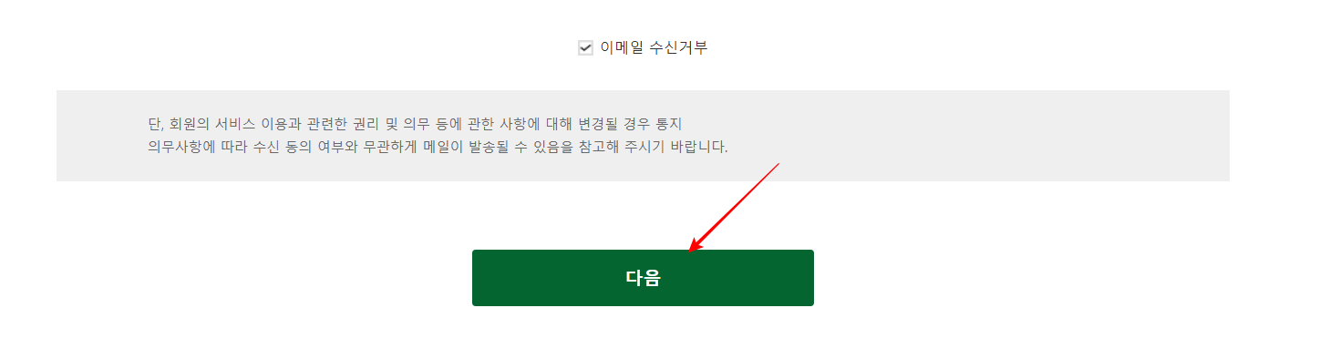 이후 필수 입력 항목이 표시되면 아이디, 비밀번호, 비밀번호 확인, 이름, 이메일을 입력합니다. 이후 하단에서 있는 다음 버튼을 클릭합니다.