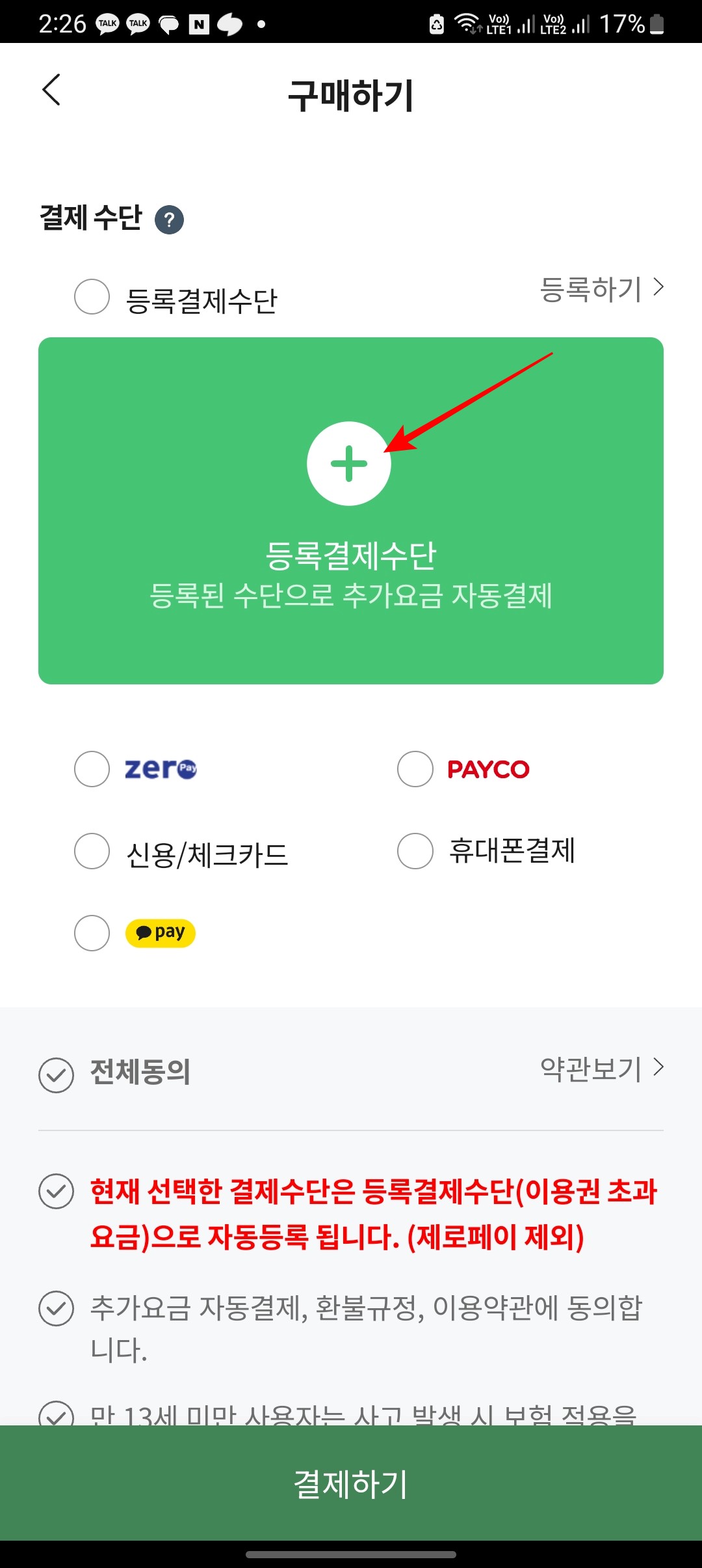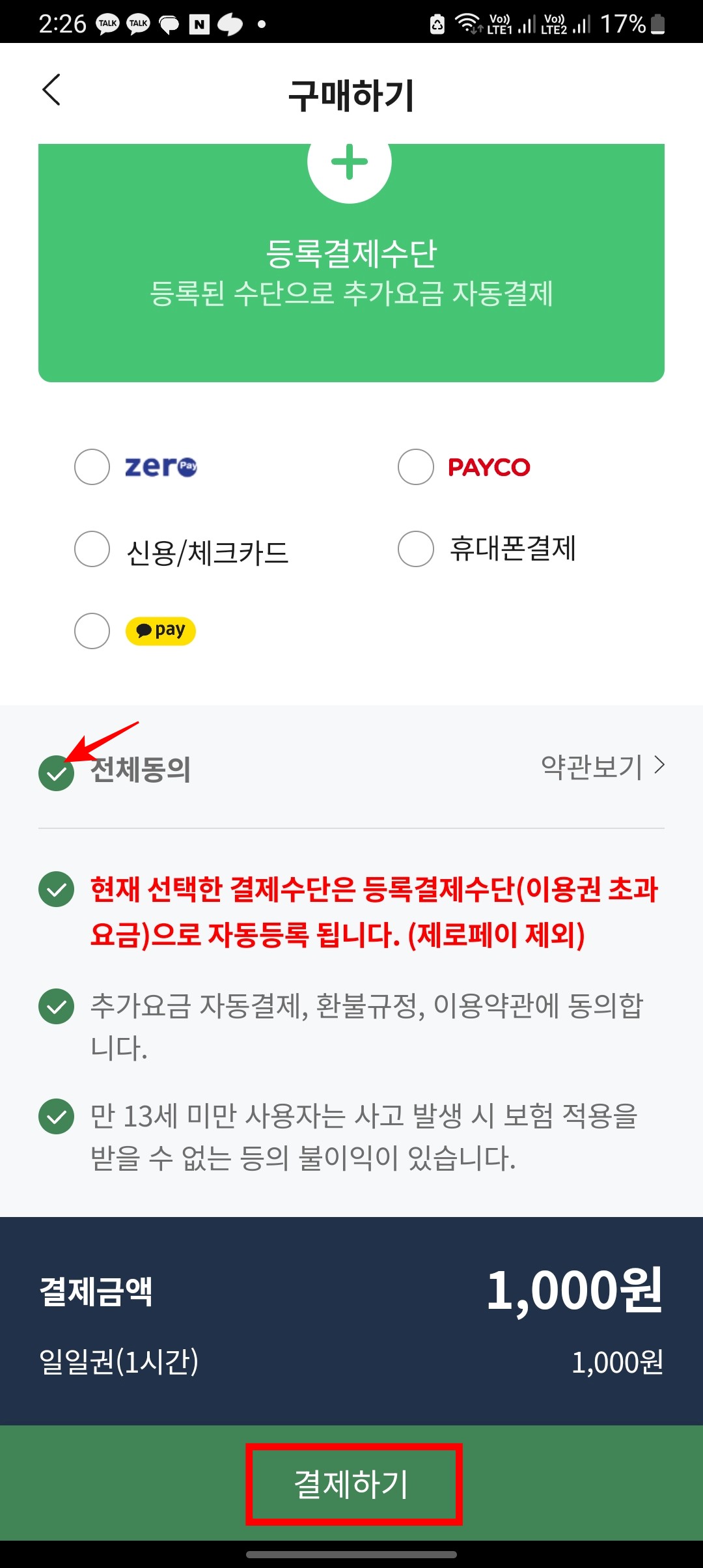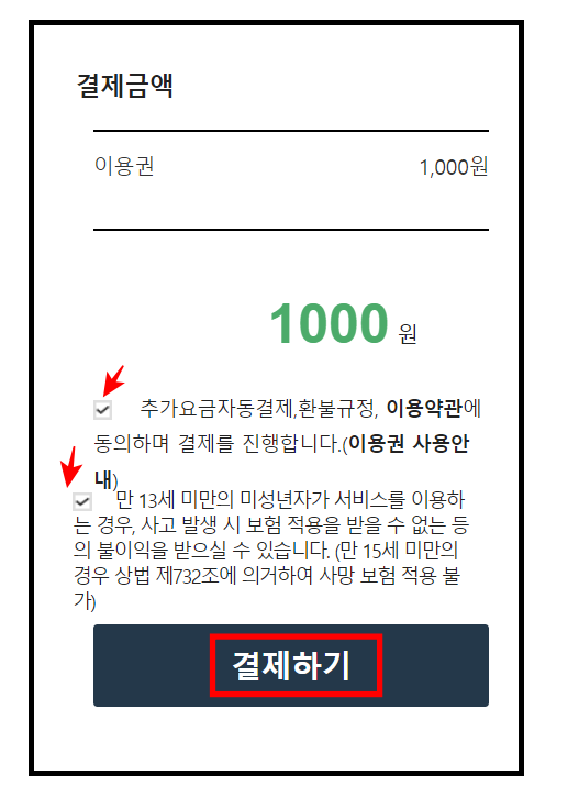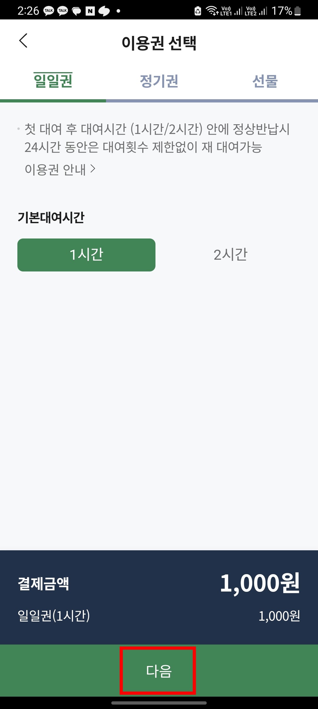 일일권, 정기권, 선물 중 원하는 메뉴를 터치합니다. 여기에서는 일일권 기본대여시간 1시간으로 진행해 보았습니다. 이후 하단에서 다음 버튼을 터치합니다. 결제수단을 등록하거나 선택하고 하단의 약관에 전체동의합니다. 이후 하단의 결제하기 버튼을 클릭하면 이용권 구매가 완료됩니다.