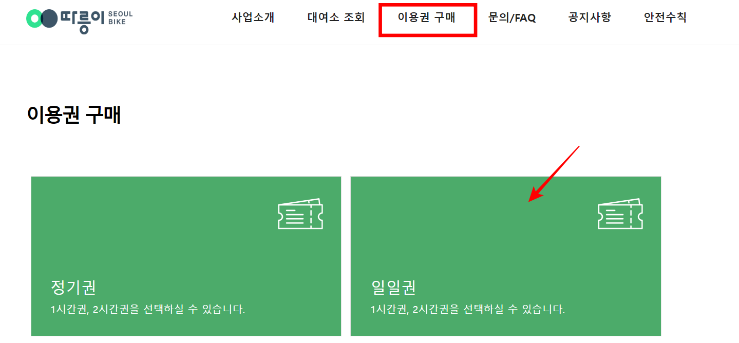 따릉이는 정기권과 일일권으로 결제할 수 있으며 비회원도 일일권은 이용할 수 있습니다. 일일권의 경우 1시간에 1천 원에 이용할 수 있으므로 웬만한 자전거 대여점 보다 가성비가 높은 것도 특징입니다.