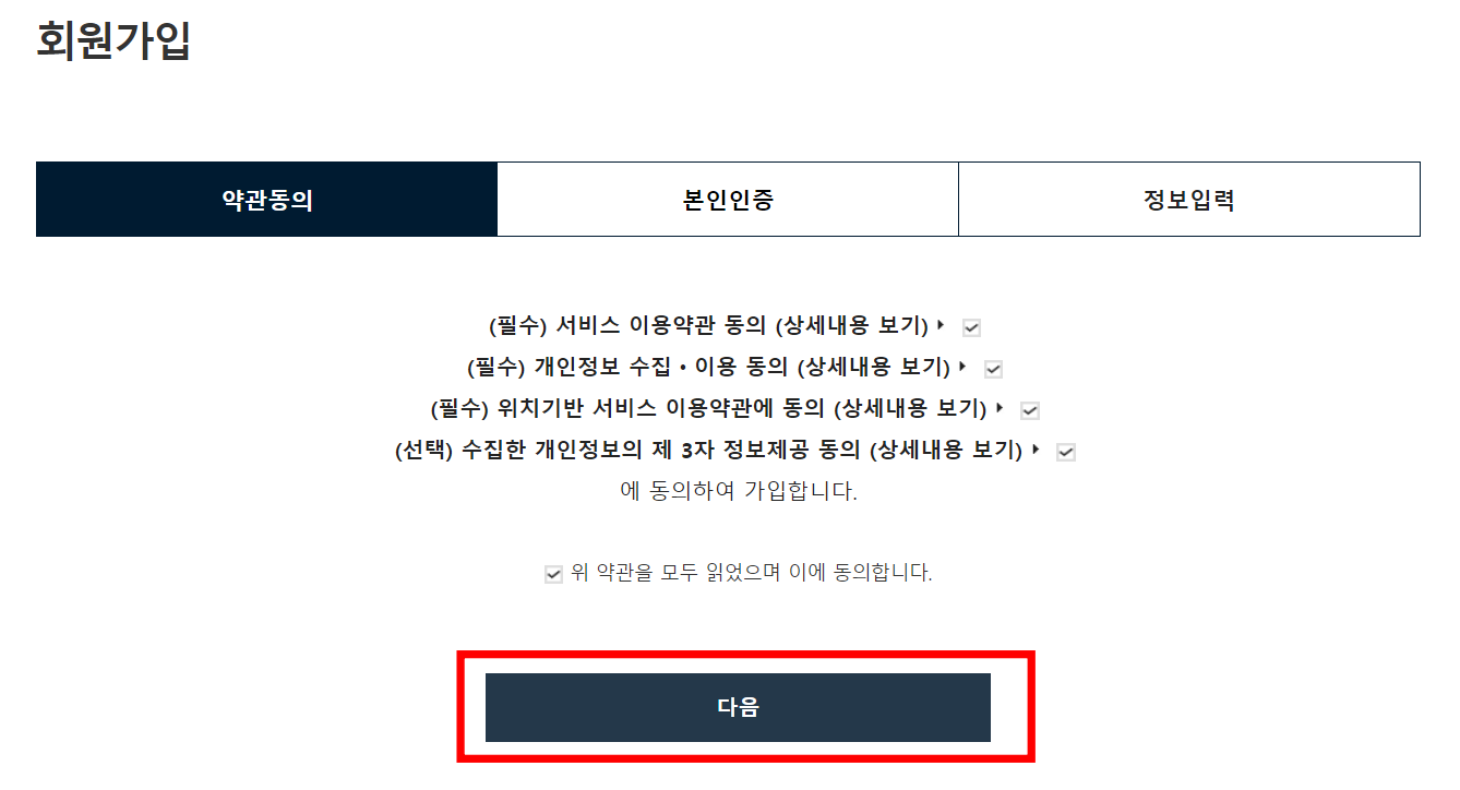 약관동의를 하시고 하단의 다음 버튼을 클릭합니다. 본인인증 메뉴에서 공란에 휴대폰 번호를 입력하시고 하단의 다음 버튼을 클릭합니다. 인증번호가 문자로 전송되면 인증번호를 입력란에 입력합니다.