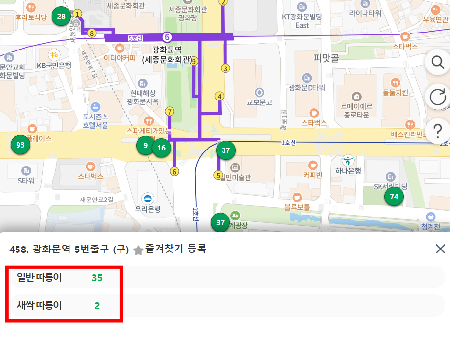회원가입이 완료되었다면 상단 메뉴에서 대여소 조회를 클릭합니다. 현 위치에서 찾을 수 있는 따릉이 대여소를 지도 위에서 찾을 수 있습니다. 대여소 번호를 클릭하면 현재 대여가 가능한 일반 따릉이와 새싹 따릉이 숫자를 알 수 있습니다.