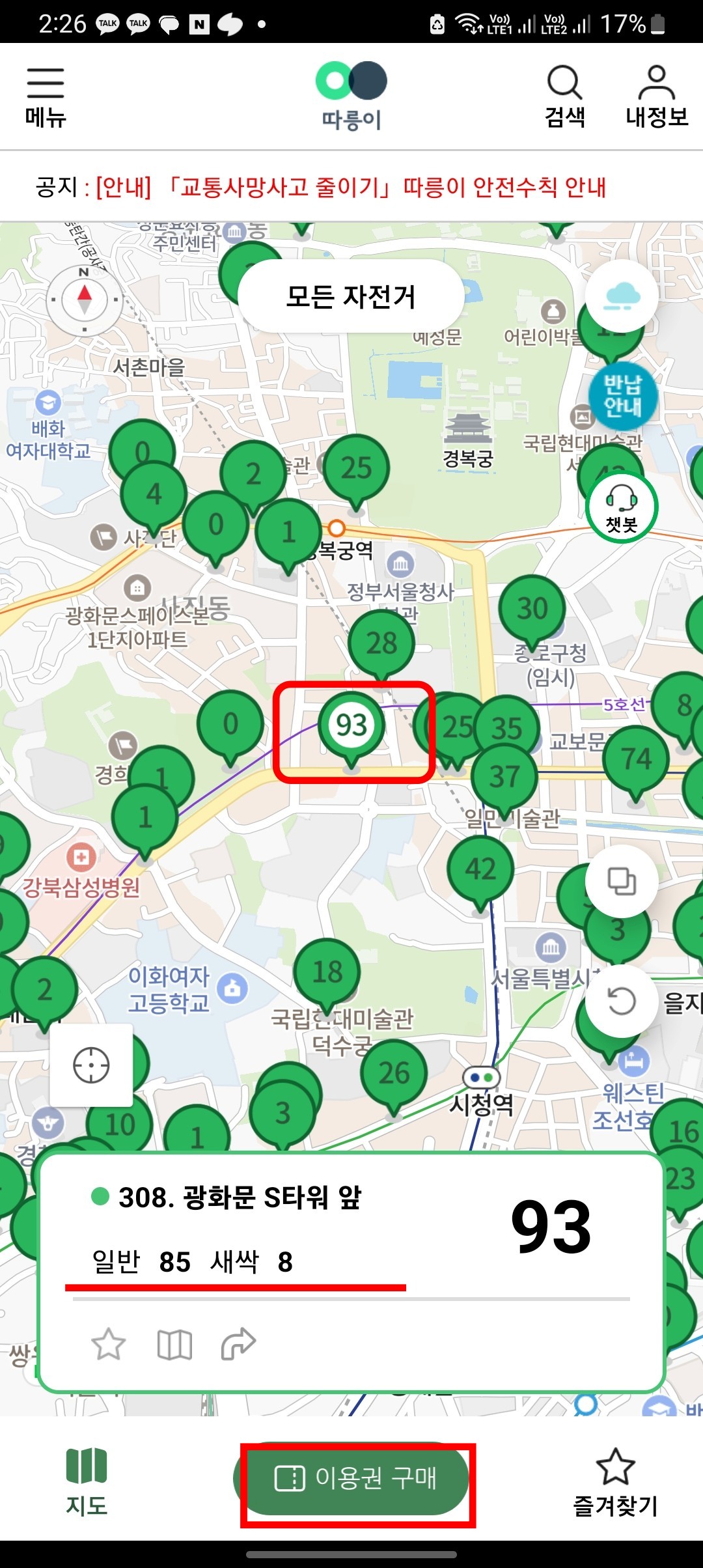 자신이 위치한 장소에서 따릉이 대여소를 화면에서 찾아볼 수 있습니다. PC에서와 마찬가지로 대여소 번호를 터치하면 대여가능한 일반과 새싹 따릉이 숫자를 확인할 수 있습니다. 하단의 이용권 구매 버튼을 터치합니다.