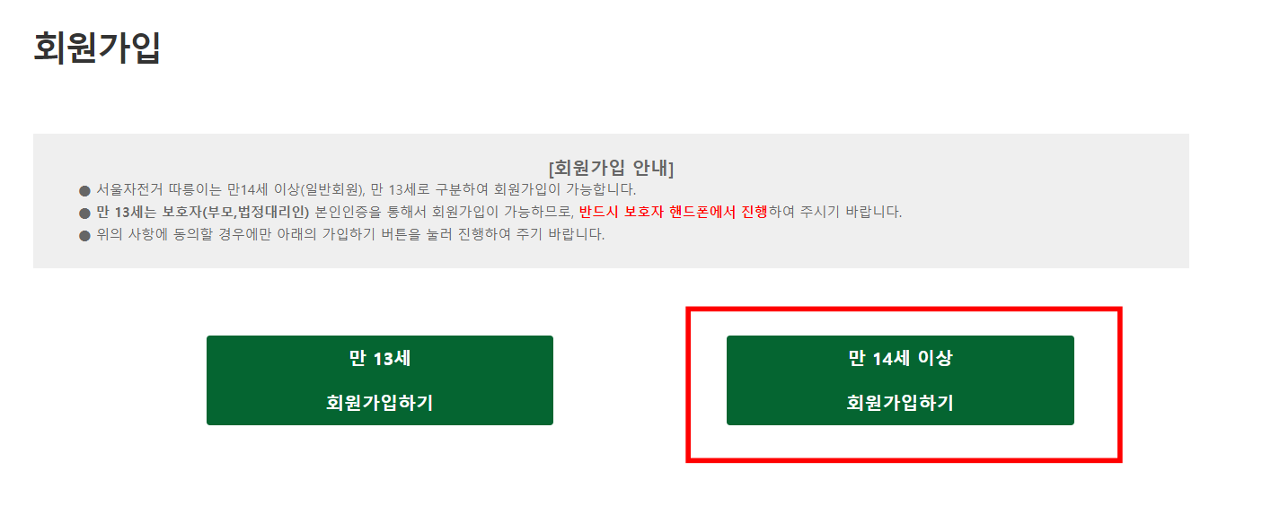 따릉이 홈페이지에 도착하시면 위와 같은 화면을 볼 수 있습니다. 비회원도 일일권을 구매할 수 있지만 자주 사용할 것이라면 회원가입을 하는 것을 추천드립니다. 상단 우측 메뉴에서 회원가입 메뉴를 클릭합니다. 회원가입 페이지가 표시되면 만 14세 이상 회원가입하기를 선택합니다.