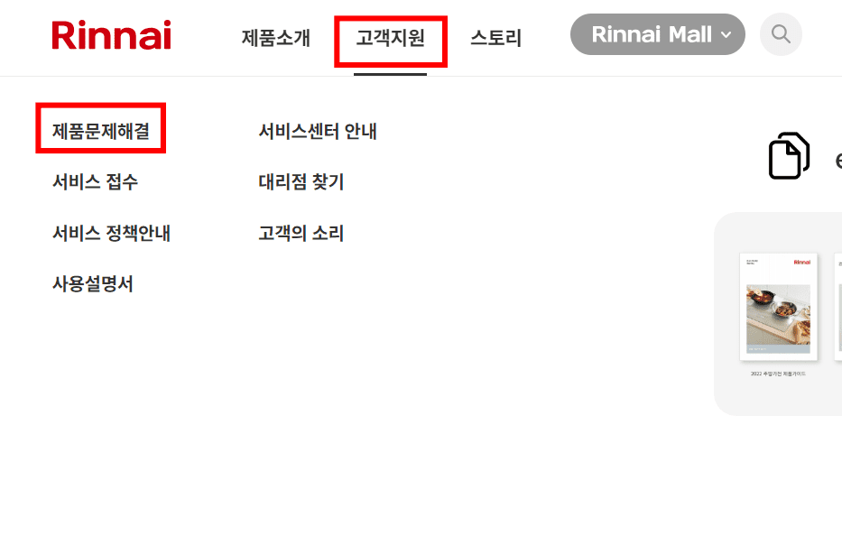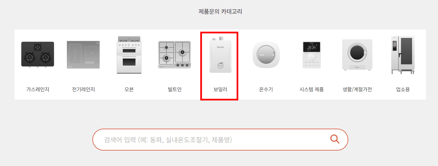 린나이보일러 서비스센터에서는 제품문제해결을 위한 서비스를 제공하고 있습니다. 홈페이지 고객지원 > 제품문제해결 메뉴를 클릭합니다. 이후 하단 제품 카테고리에서 보일러를 선택하시면 콘덴싱 보일러, 일반 보일러, LoT 실내온도조절기 중 보유한 제품을 선택합니다.