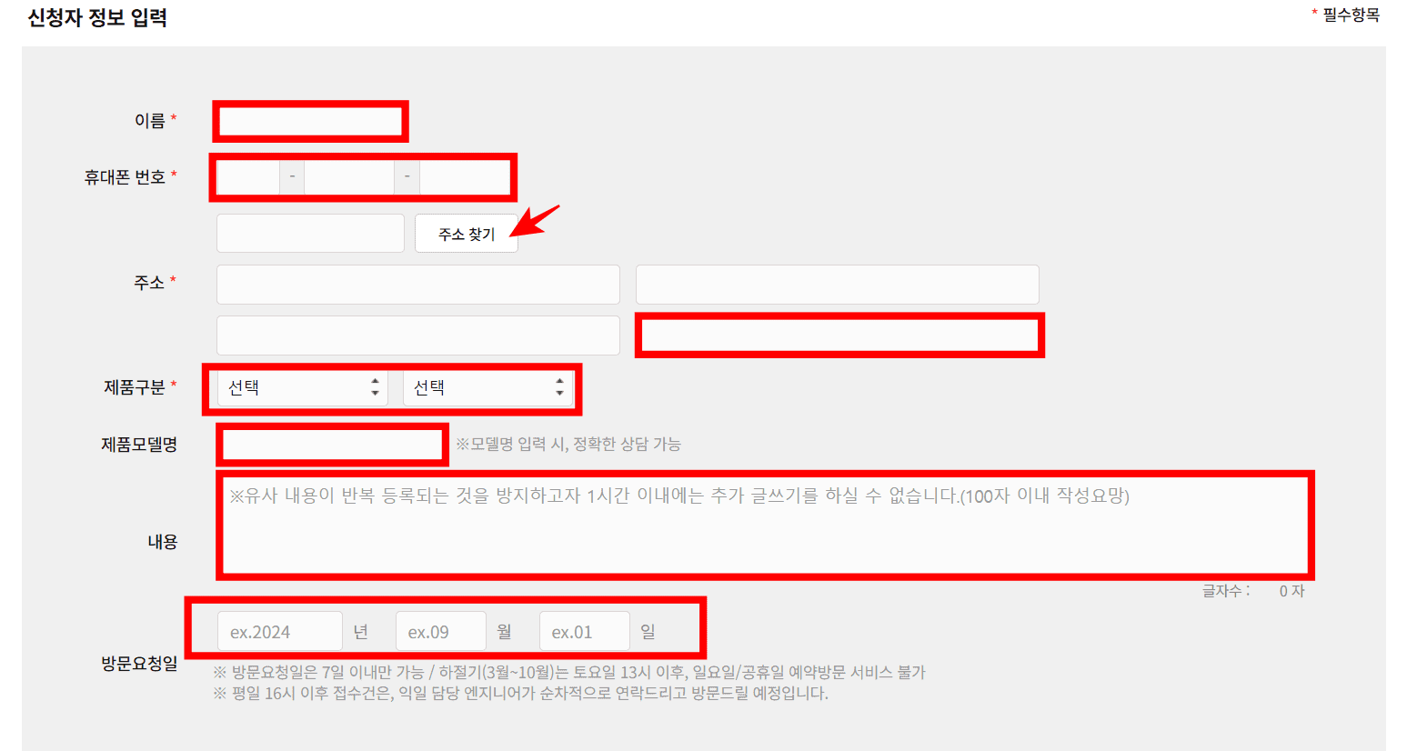 서비스 신청 페이지에서 스크롤을 내려 신청자 정보를 입력합니다. 이름, 휴대폰 번호, 주소찾기 버튼 클릭 후 주소 입력, 제품구분 선택, 제품 모델명과 이상증상을 내용에 기재합니다. 이후 방문 요청일을 년월일로 입력합니다.