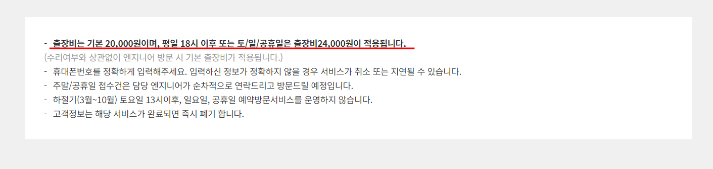 린나이보일러 서비스센터 AS를 신청하게 되면 기본 출장비 2만원이 부과되며 평일 오후 6시 이후나 토, 일, 공휴일은 출장비가 2만 4천 원이 부과되니 참고하시기 바랍니다.