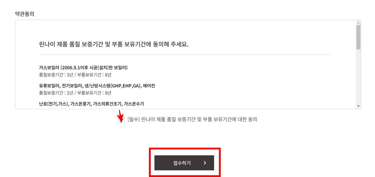 이후 하단의 약관동의에 모두 동의하시고 아래 접수하기 버튼을 클릭하면 AS 접수가 완료됩니다.