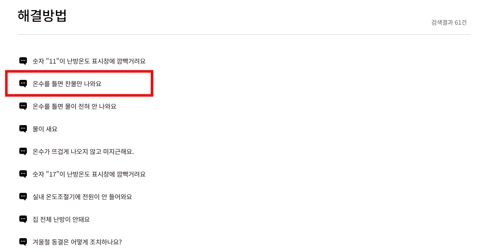이후 하단을 확인하시면 해결방법에 대한 다양한 증상이 목록으로 표시됩니다. 여기에서는 ‘온수를 틀면 찬물만 나와요’ 항목을 선택해 보겠습니다. 해당 증상에 대한 문제 해결 방법이 화면에 표시됩니다. 만약 해결되지 않으면 하단의 출장 서비스 예약 링크를 클릭하여 서비스를 접수하면 됩니다.