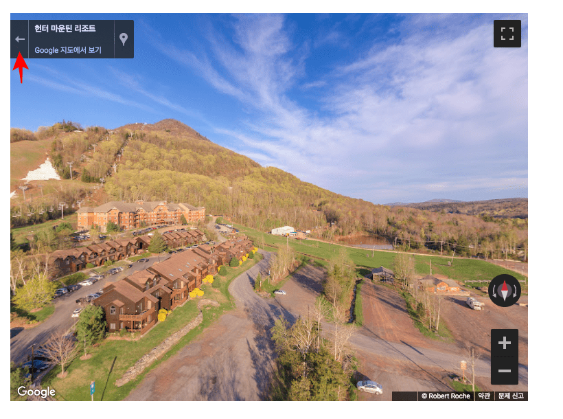 확대된 미국 지도보기에서는 주황색 아이콘을 더 다양하게 발견할 수 있습니다. 우측 하단의 사람 모양 아이콘을 드래그하여 주황색 아이콘에 가져가면 해당 지역의 로드뷰를 볼 수 있습니다. 로드뷰에서 나가려면 좌측 상단의 화살표 아이콘을 클릭합니다.