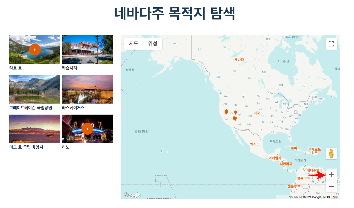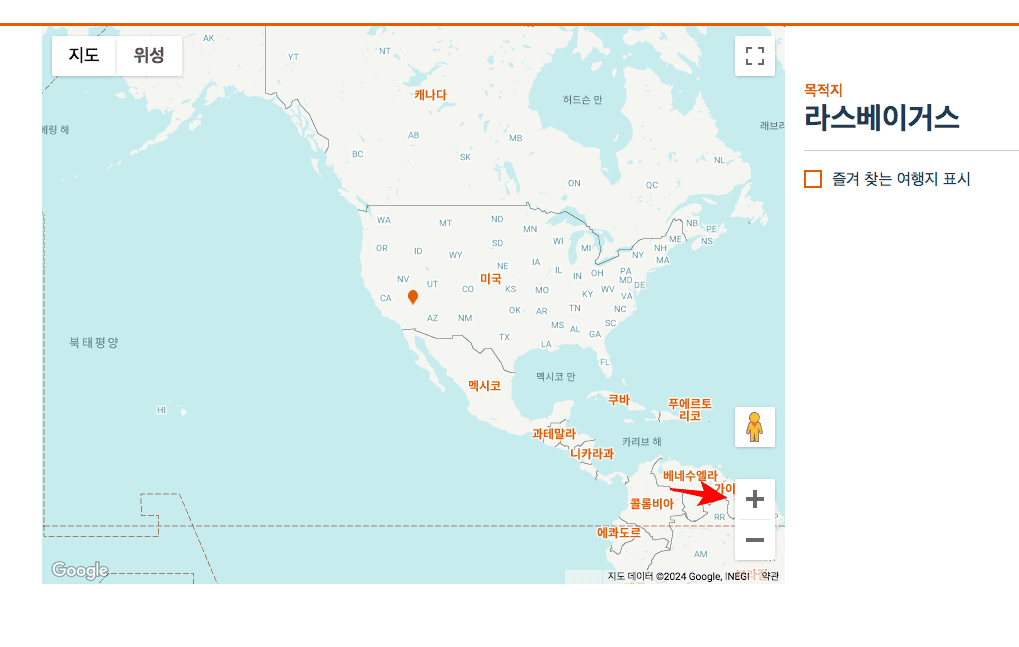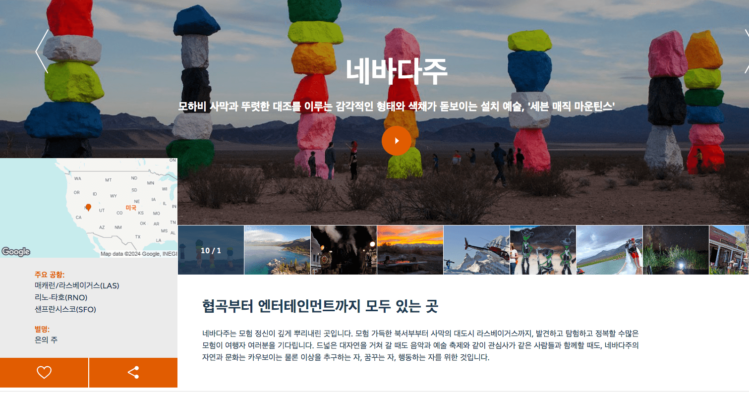네바다주 목적지 탐색 화면이 보이면 미국지도 우측 하단의 버튼으로 확대합니다. 라스베이거스를 지도에서 찾아보고 우측에서 라스베이거스 관련 콘텐츠를 클릭합니다.